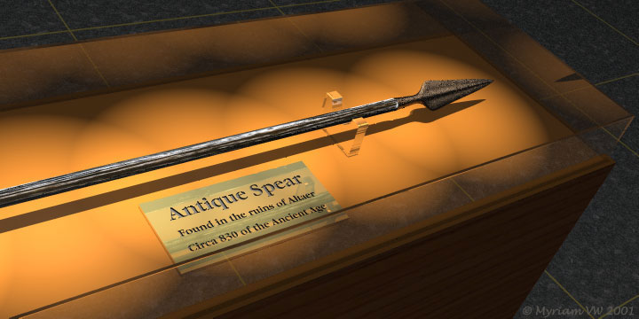 | This image just popped in my mind after Gary Vennié had sent me a spear model he had made. Thank you for the model and the inspiration. | Cette image est née dans mon esprit dès le moment où j'ai vu le modèle de lance que Gary Vennié a créé. Merci pour le modèle et pour l'inspiration. |